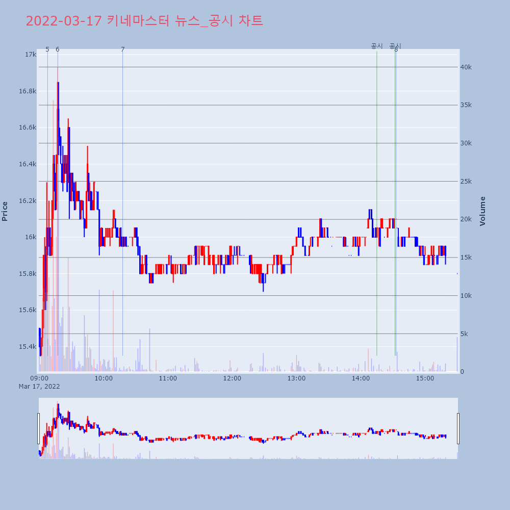 | 3 | 키네마스터, +10.95% VI 발동키네마스터(139670)가 VI가 발동했다. 전일 대비 | 조선경제 | 키네마스터 | 2022-03-16 09:17:52 |