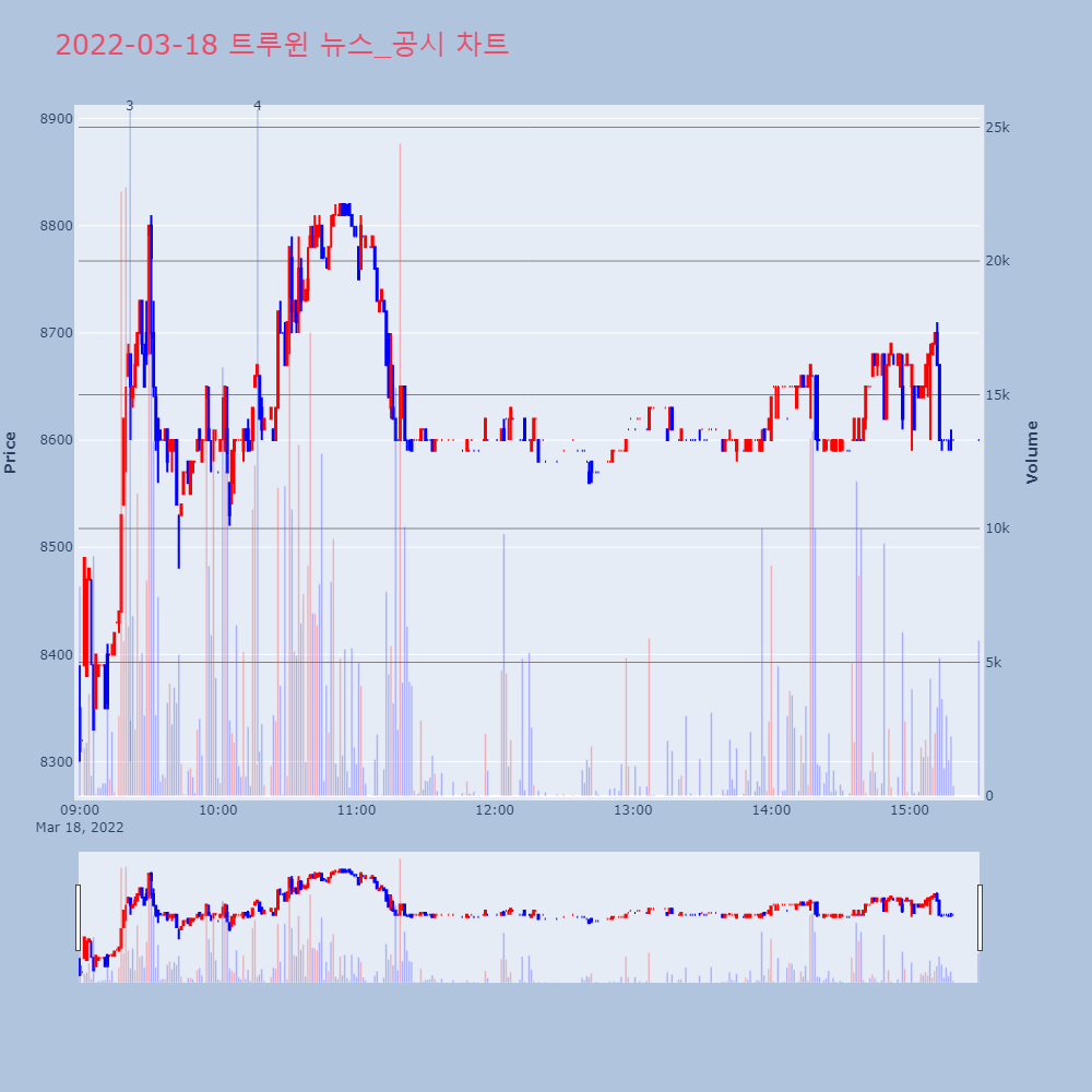 | 4 | [장중수급포착] 트루윈, 외국인 74,648주 대량 순매수... 주가 +2.87% [서울=뉴스핌] 로보뉴스 = 18일 10시 15분 현재 | 뉴스핌 | 트루윈 | 2022-03-18 10:17:10 |