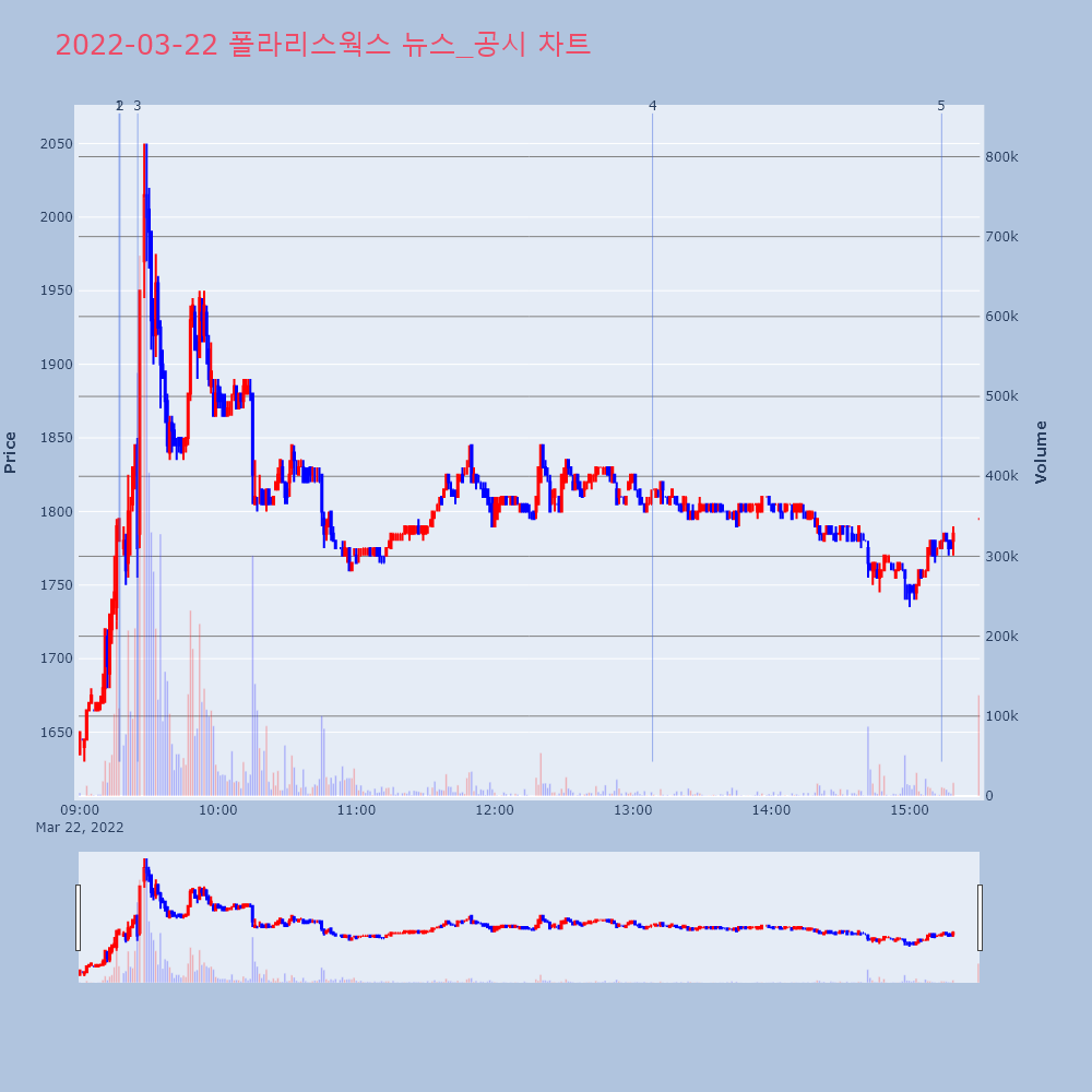 | 2 | 폴라리스웍스, +10.46% VI 발동폴라리스웍스(123010)가 VI가 발동했다. 전일 대 | 조선경제 | 폴라리스웍스 | 2022-03-22 09:17:27 |