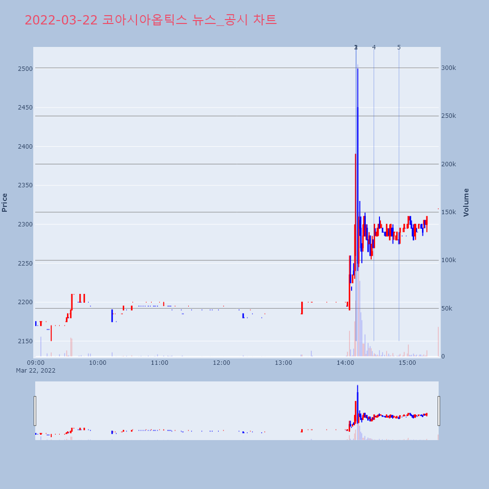 | 3 | 코아시아옵틱스, +10.14% VI 발동코아시아옵틱스(196450)가 VI가 발동했다. 전일 | 조선경제 | 코아시아옵틱스 | 2022-03-22 14:10:27 |