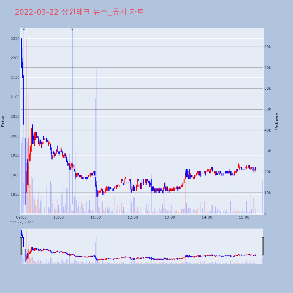 | 2 | 장원테크, -12.07% VI 발동장원테크(174880)가 VI가 발동했다. 전일 대비 | 조선경제 | 장원테크 | 2022-03-22 09:03:50 |