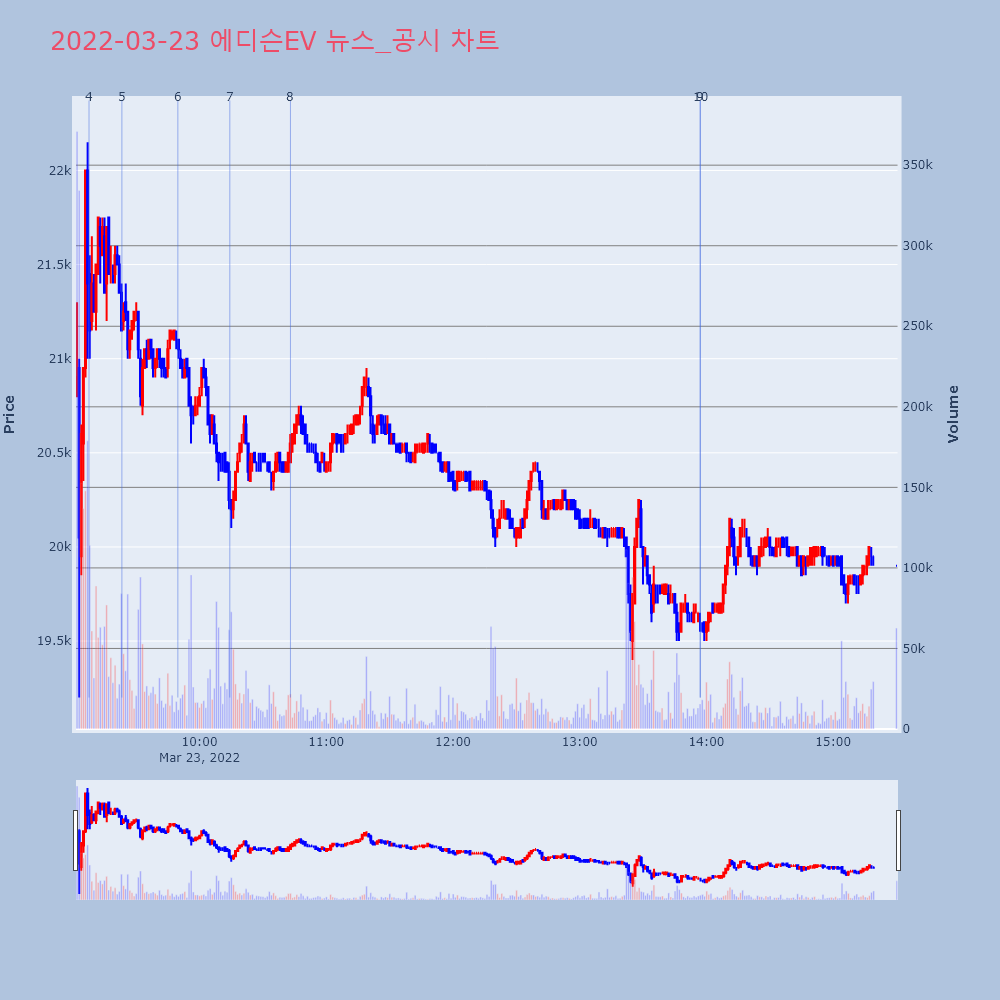 | 6 | 에디슨EV, 관리종목 지정 우려에 10% 급락에디슨EV가 4년 연속 영업손실로 관리종목 지정 우려 | 한경/증권 | 에디슨EV | 2022-03-23 09:49:44 |