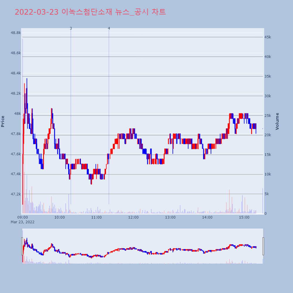 | 3 | [장중수급포착] 이녹스첨단소재, 기관 7일 연속 순매수행진... 주가 +1.93%[서울=뉴스핌] 로보뉴스 = 23일 10시 15분 현재 | 뉴스핌 | 이녹스첨단소재 | 2022-03-23 10:18:24 |