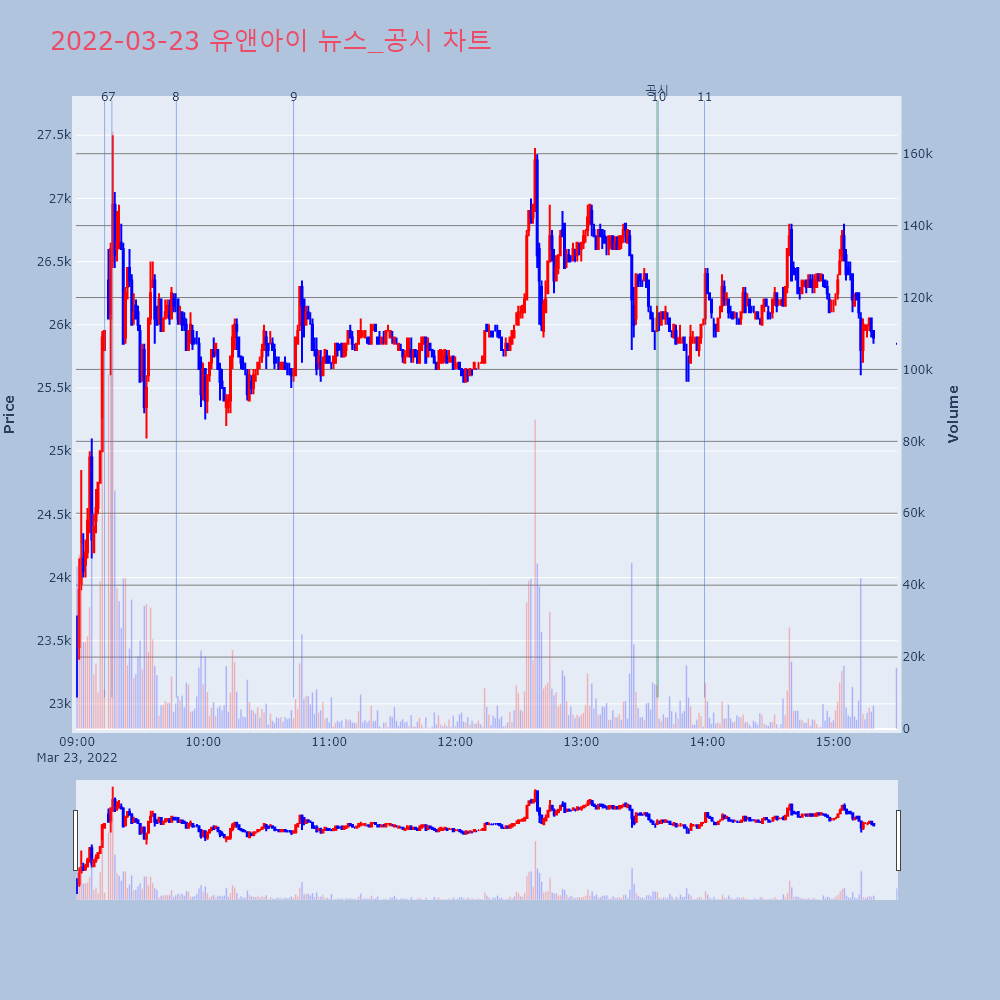 | 6 | 유앤아이, +7.45% VI 발동유앤아이(056090)가 VI가 발동했다. 전일 대비 | 조선경제 | 유앤아이 | 2022-03-23 09:13:07 |