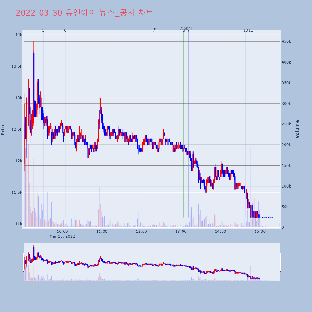 | 11 | [이시각 하한가] 유앤아이(▼4700) - 30일 오후 14시45분[이투데이/e2BOT 기자(e2bot@etoday.co | 이투데이 | 유앤아이 | 2022-03-30 14:46:02 |
