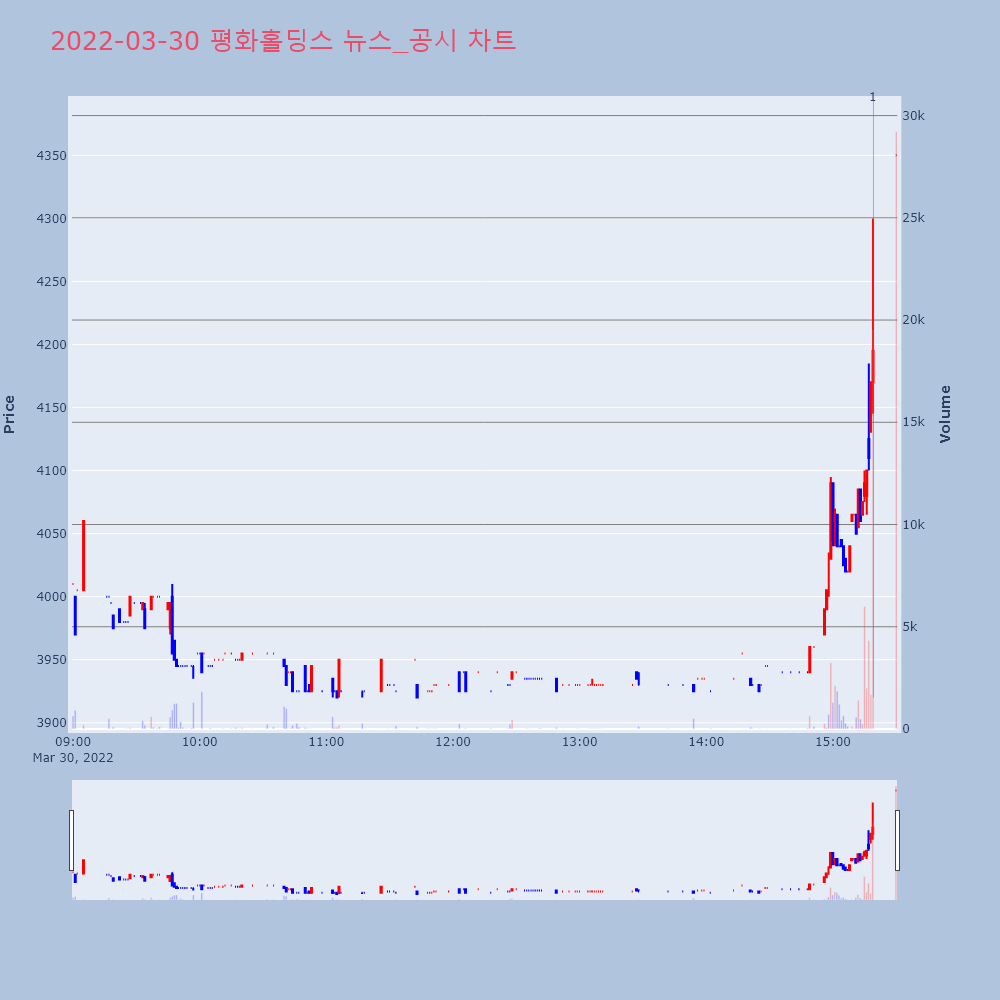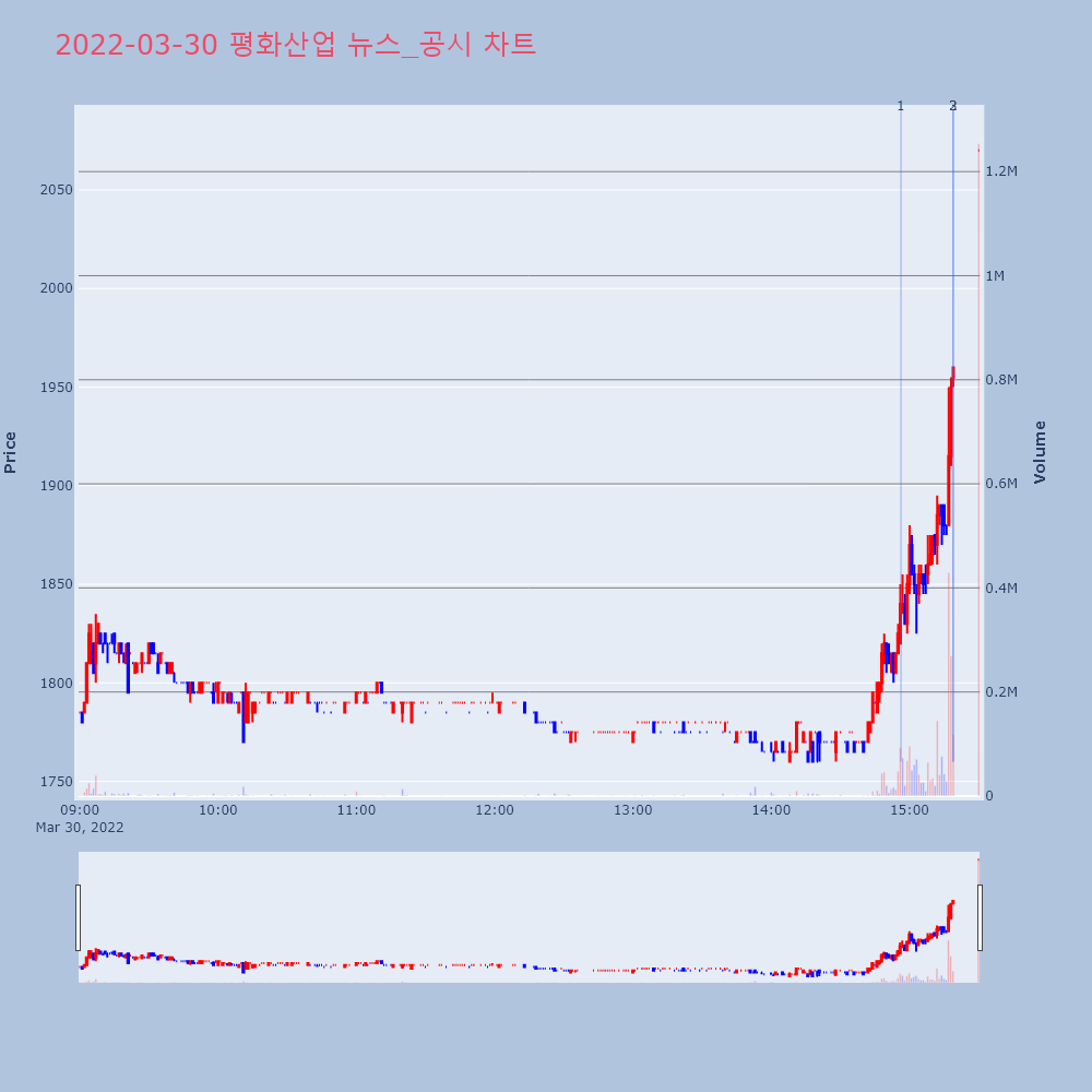 | 3 | 평화산업, +9.24% VI 발동평화산업(090080)이 VI가 발동했다. 전일 대비 | 조선경제 | 평화산업 | 2022-03-30 15:19:03 |