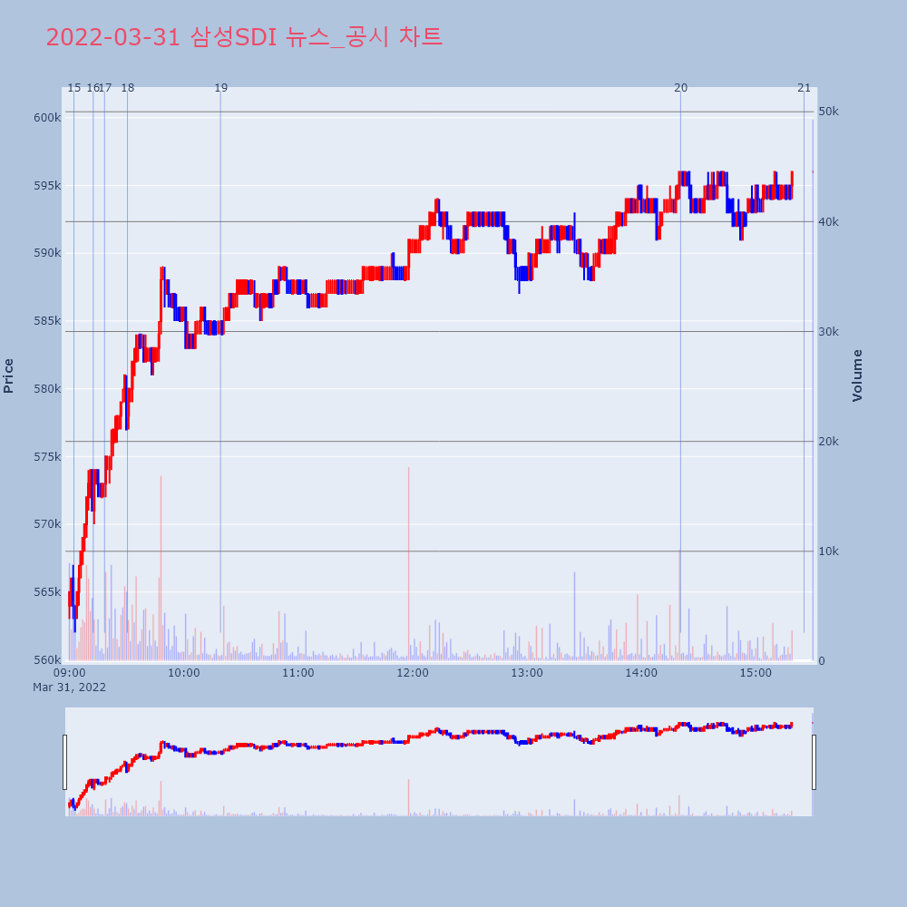 | 20 | [특징주] 삼성SDI, 전기차 원형전지 매출 본격화 기대… 6%↑ 제목 : [특징주] 삼성SDI, 전기차 원형전지 매출 | 인포스탁 | 삼성SDI | 2022-03-31 14:20:36 |