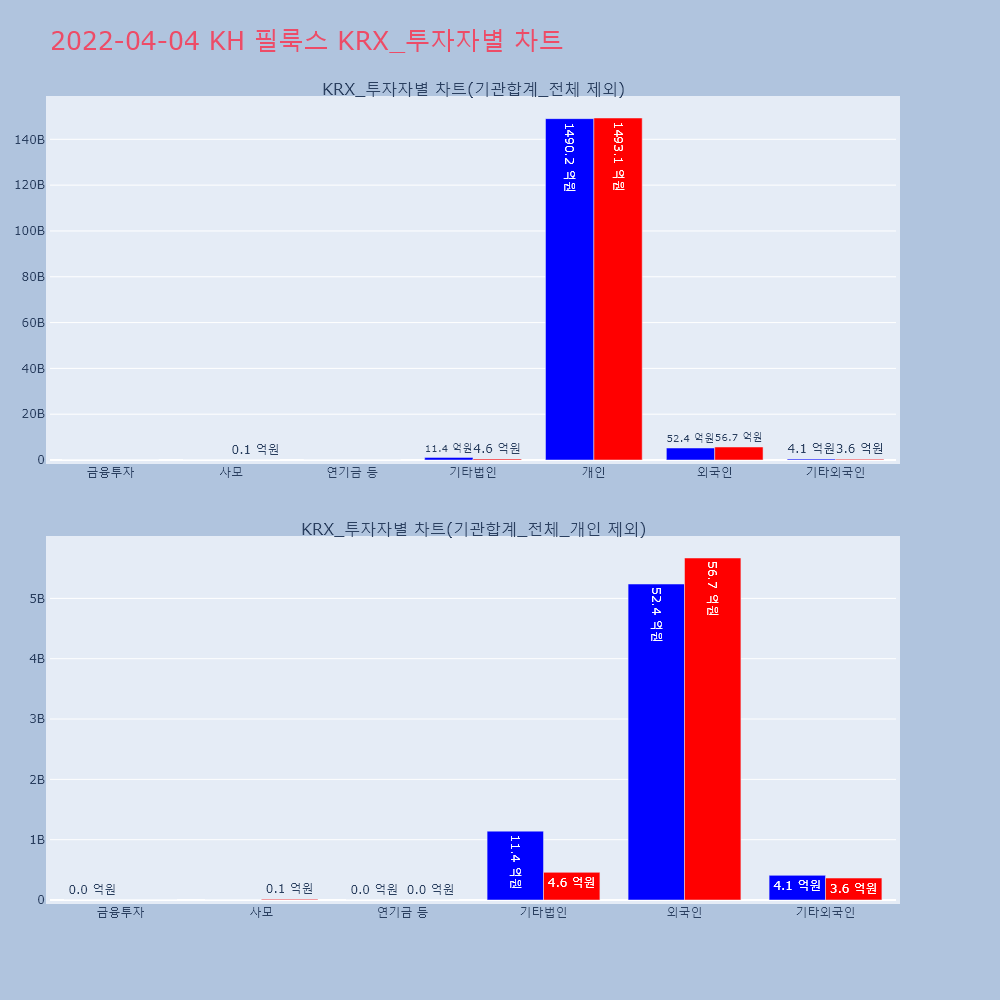 | 4 | [장중수급포착] KH 필룩스, 외국인/기관 동시 순매수… 주가 +23.93% [서울=뉴스핌] 로보뉴스 = 04일 14시 35분 현재 | 뉴스핌 | KH 필룩스 | 2022-04-04 14:35:22 |