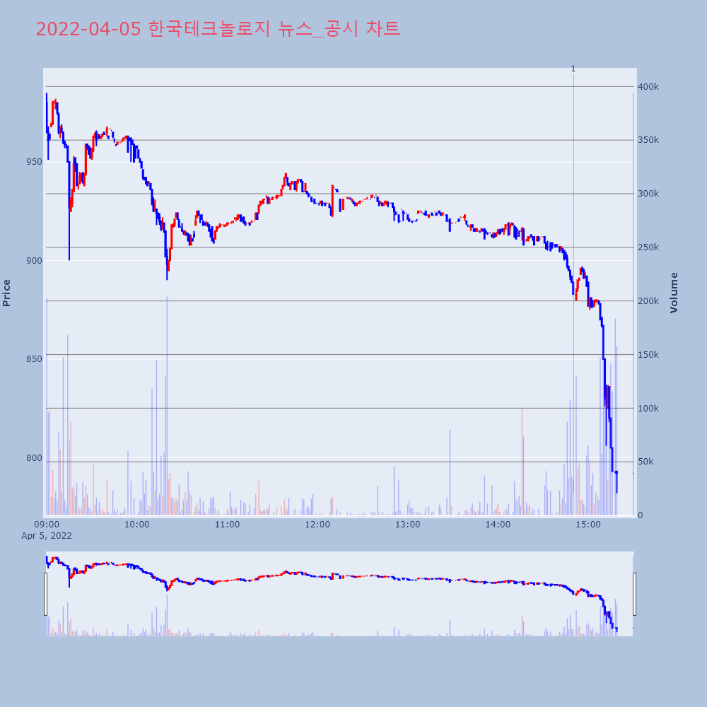 | 1 | 한국테크놀로지, -11.74% VI 발동한국테크놀로지(053590)가 VI가 발동했다. 전일 | 조선경제 | 한국테크놀로지 | 2022-04-05 14:50:18 |