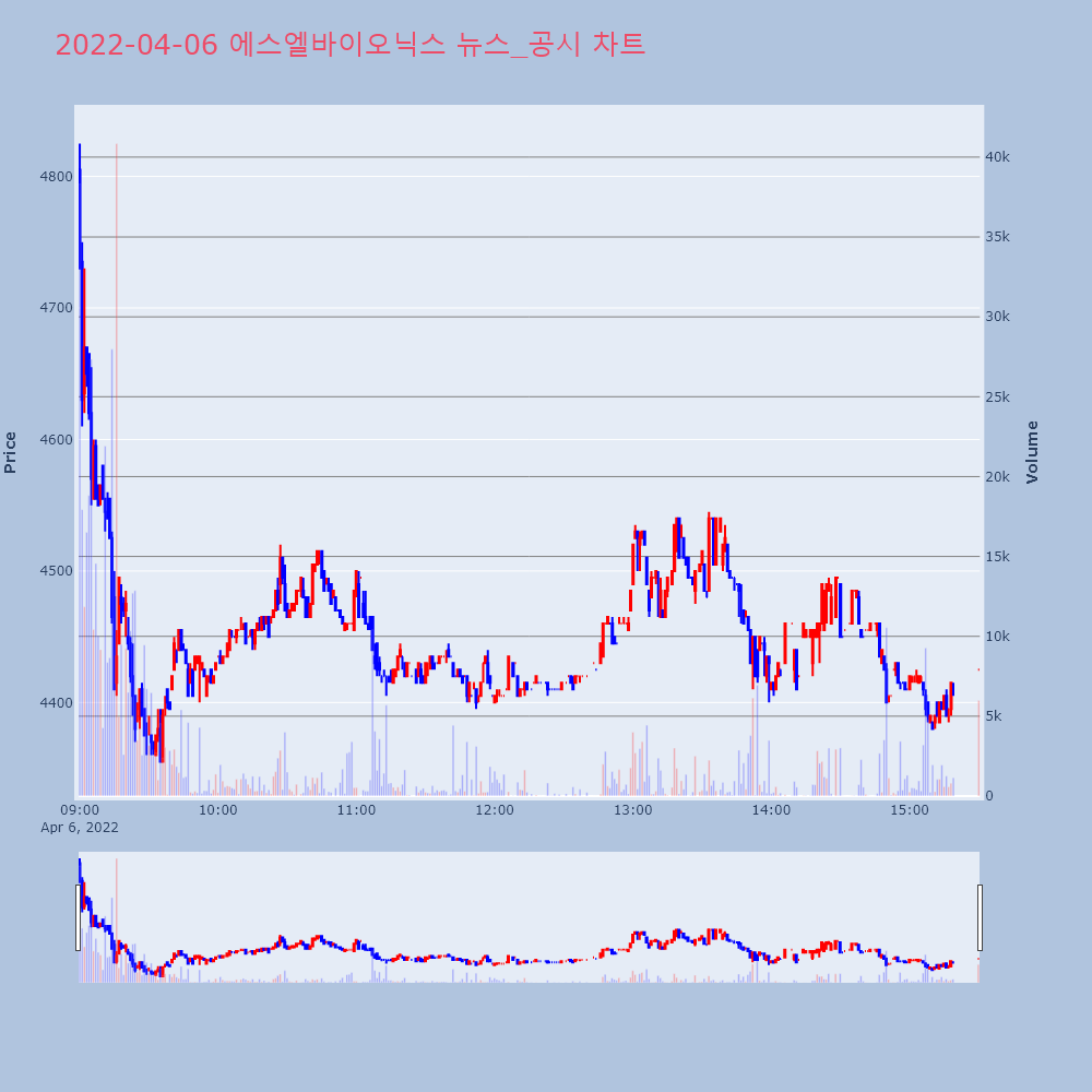 | 7 | 에스엘바이오닉스, +12.83% VI 발동에스엘바이오닉스(214310)가 VI가 발동했다. 전일 | 조선경제 | 에스엘바이오닉스 | 2022-04-05 14:49:03 |