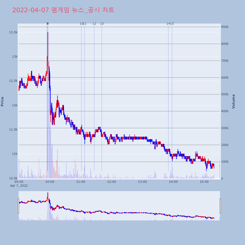 | 4 | [장중수급포착] 엠게임, 기관 73,000주 대량 순매수... 주가 +15.42% [서울=뉴스핌] 로보뉴스 = 06일 11시 30분 현재 | 뉴스핌 | 엠게임 | 2022-04-06 11:30:26 |