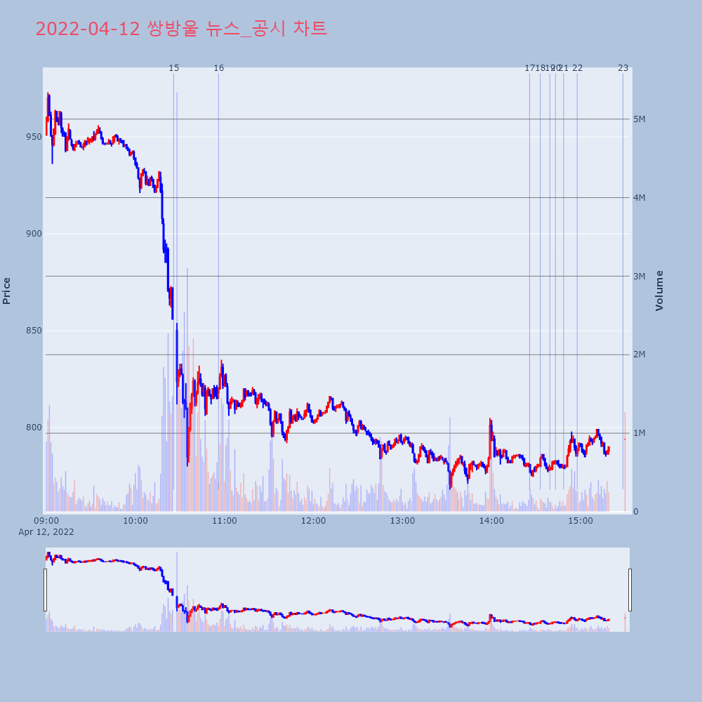 | 22 | [특징주]'KB증권 인수자금 조달 계획 철회'…쌍방울, 급락세[아시아경제 이선애 기자]KB증권의 4500억원 규모 | 아시아경제 | 쌍방울 | 2022-04-12 14:57:46 |