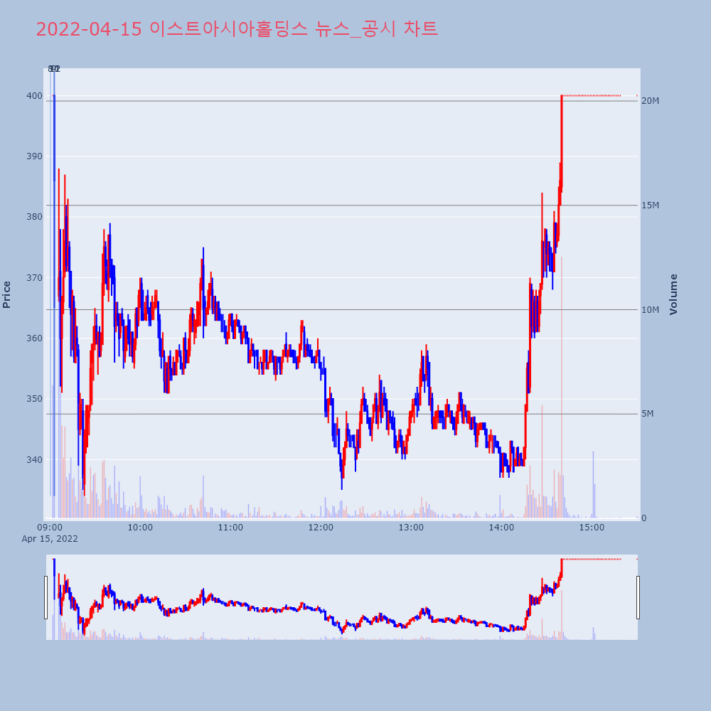 | 11 | [이시각 상한가] 이스트아시아홀딩스(▲92) - 15일 오전 9시2분[이투데이/e2BOT 기자(e2bot@etoday.co | 이투데이 | 이스트아시아홀딩스 | 2022-04-15 09:03:03 |