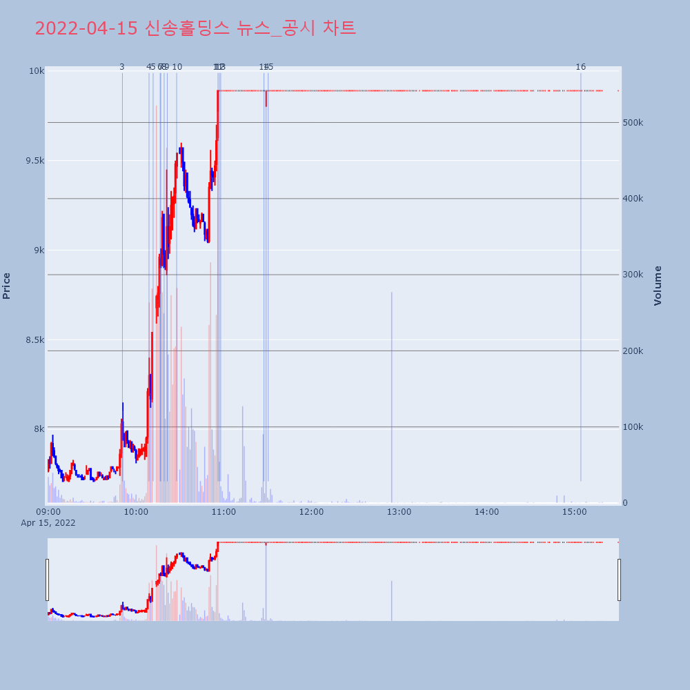 | 3 | [강세 토픽] 대두 테마, 신송홀딩스 +15.24%, 샘표 +5.38%[대두] 테마가 강세다. 전일 대비 4.25% 상승세이 | 조선경제 | 신송홀딩스 | 2022-04-15 10:16:32 |