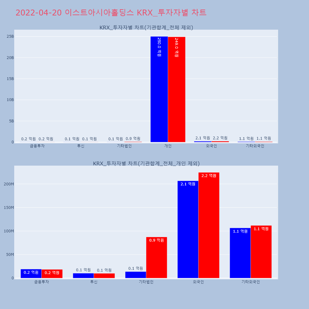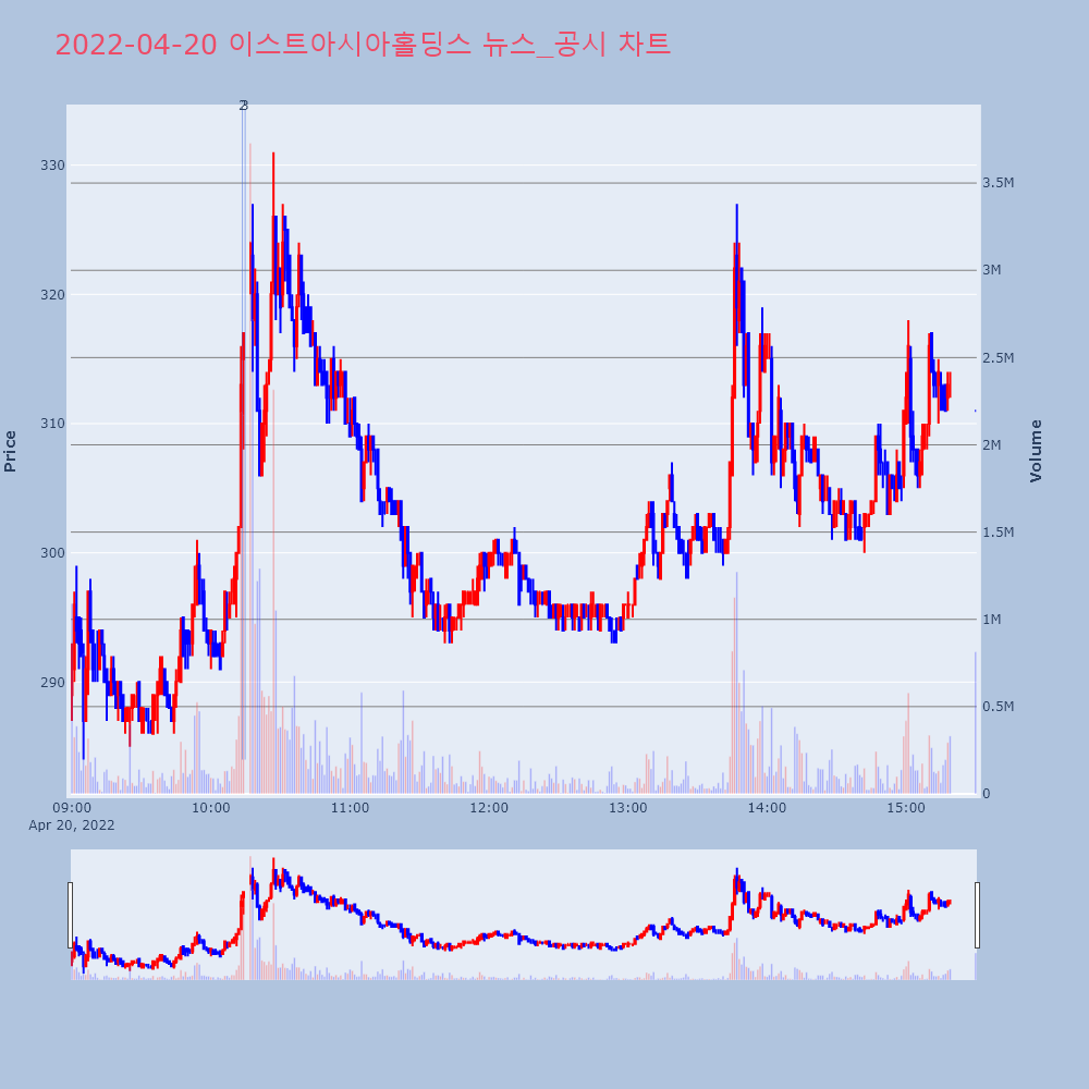 | 3 | 이스트아시아홀딩스, +6.38% VI 발동이스트아시아홀딩스(900110)가 VI가 발동했다. 전 | 조선경제 | 이스트아시아홀딩스 | 2022-04-20 10:14:46 |