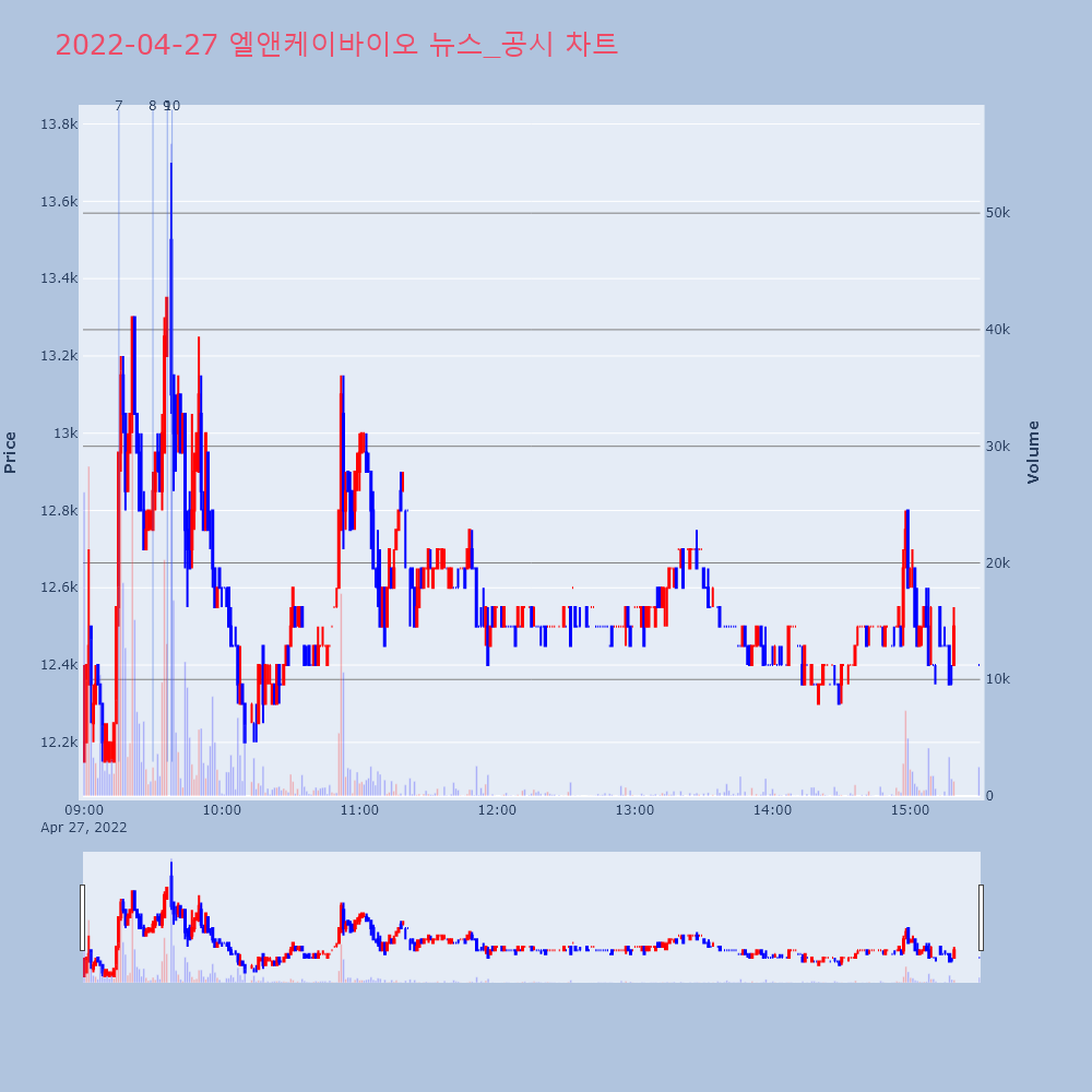| 9 | 엘앤케이바이오, +17.11% VI 발동엘앤케이바이오(156100)가 VI가 발동했다. 전일 | 조선경제 | 엘앤케이바이오 | 2022-04-27 09:36:15 |