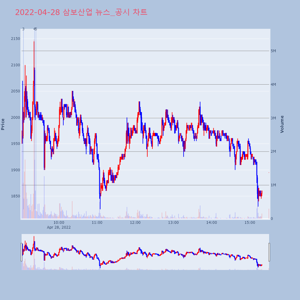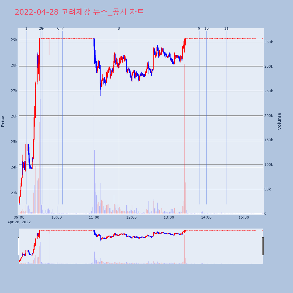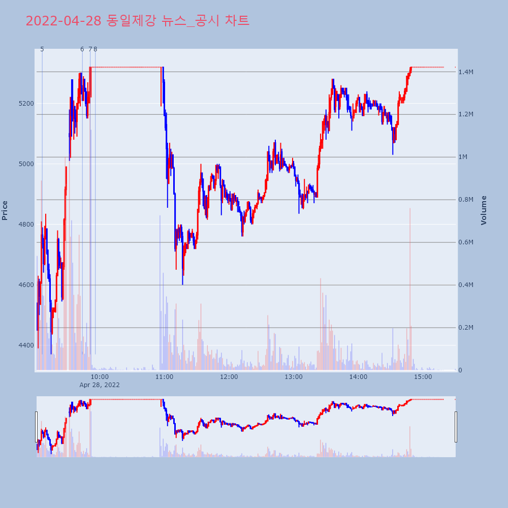 | 4 | [강세 토픽] 철강 주요업체 테마, 고려제강 +29.98%, KG스틸 +4.15%[철강 주요업체] 테마가 강세다. 전일 대비 5.06% | 조선경제 | 고려제강 | 2022-04-28 09:36:33 |