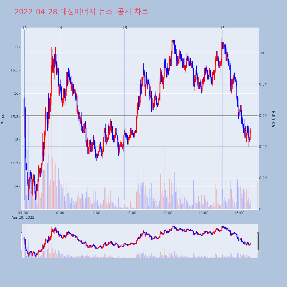 | 3 | 대성에너지, +19.52% VI 발동대성에너지(117580)가 VI가 발동했다. 전일 대비 | 조선경제 | 대성에너지 | 2022-04-27 09:19:42 |