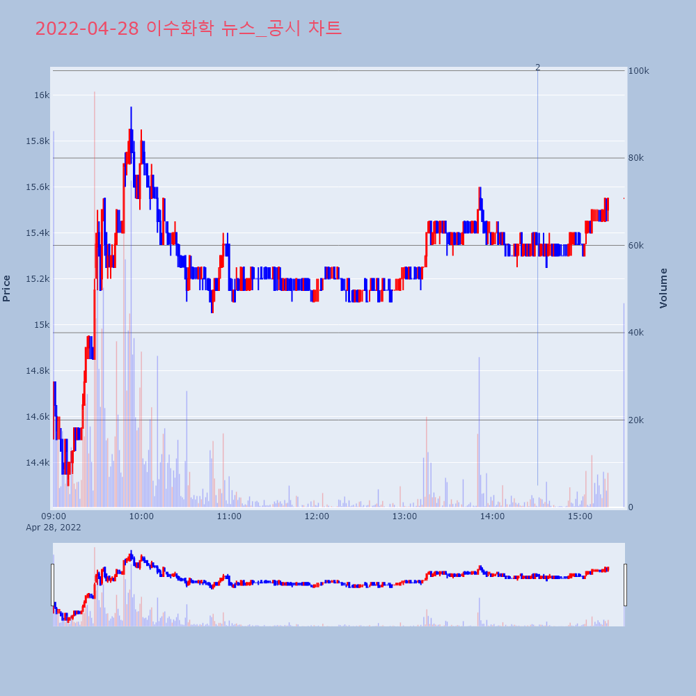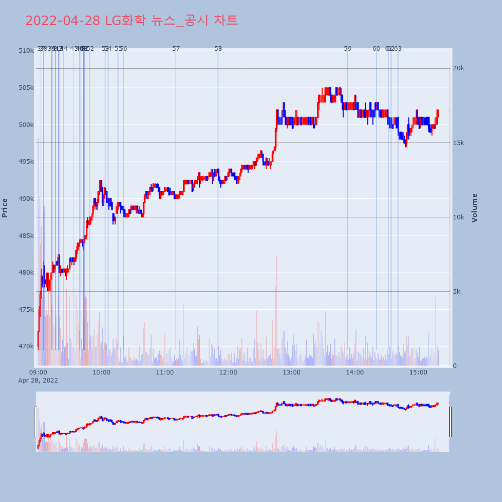 | 48 | [특징주] LG화학, 역대급 분기 매출 소식에 강세장 초반 LG화학(051910)의 주가가 오르고 있다. | 조선경제 | LG화학 | 2022-04-28 09:42:41 |