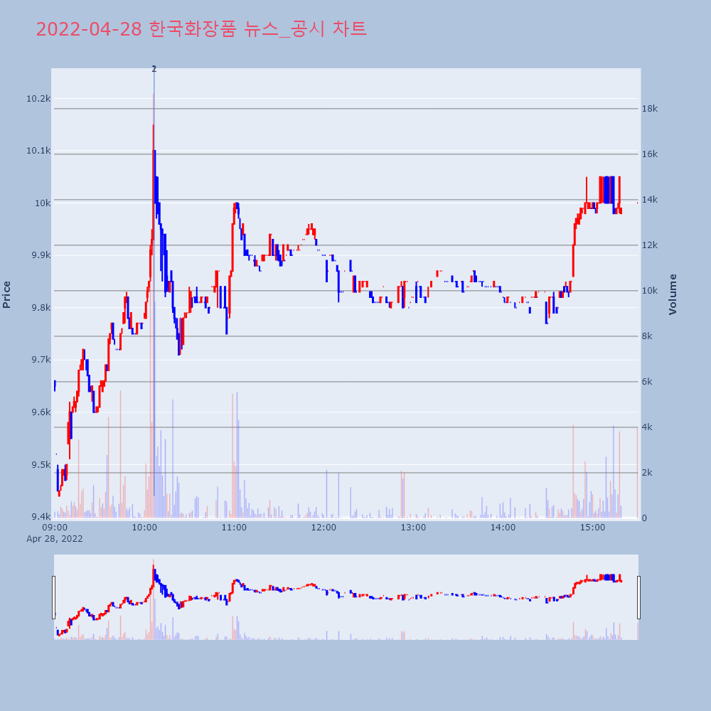 | 2 | 한국화장품, +7.75% 상승폭 확대한국화장품(123690)이 상승폭을 확대하고 있다. 전 | 조선경제 | 한국화장품 | 2022-04-28 10:06:36 |