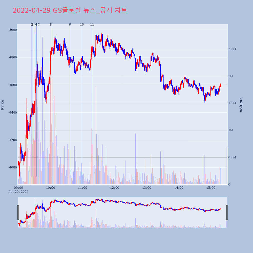 | 11 | [특징주] GS글로벌, 원자재값 급등에 호실적 기대↑… '신고가' 제목 : [특징주] GS글로벌, 원자재값 급등에 호실적 | 인포스탁 | GS글로벌 | 2022-04-29 11:17:26 |