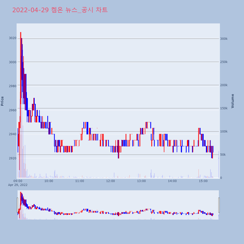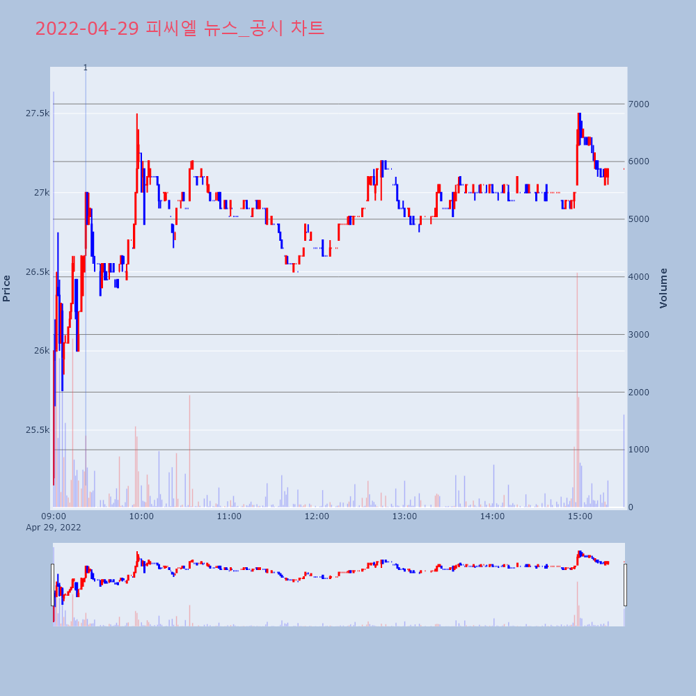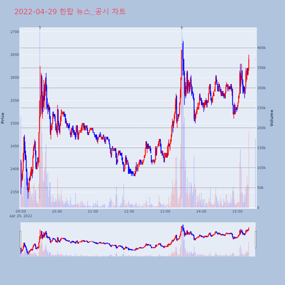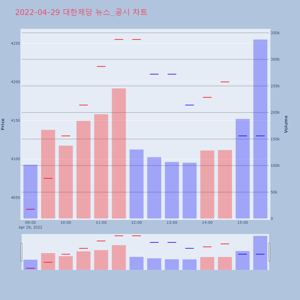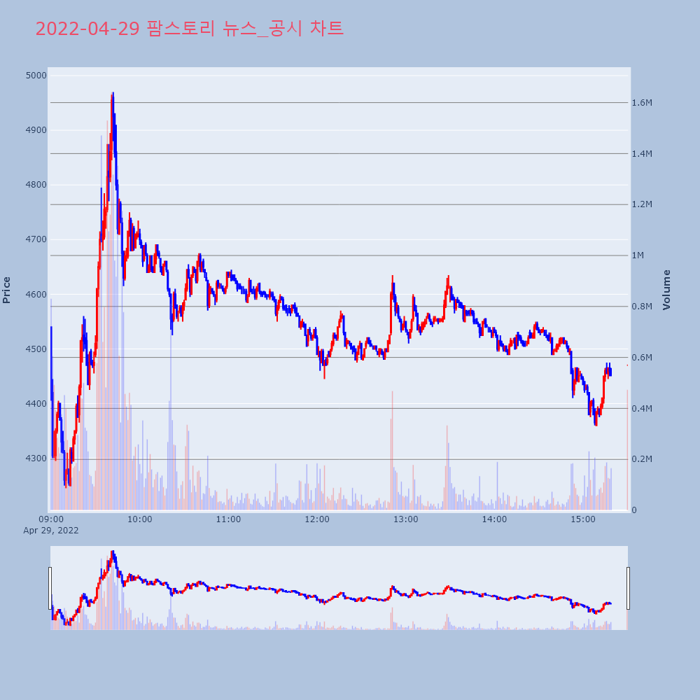 | 4 | [강세 토픽] 육계주 테마, 팜스토리 +15.22%, 하림 +7.59%[육계주] 테마가 강세다. 전일 대비 2.57% 상승세 | 조선경제 | 팜스토리 | 2022-04-28 11:07:33 |