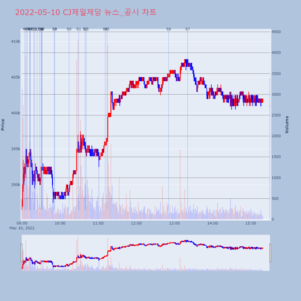 | 65 | "CJ제일제당, 현시점 가장 매력적인 방어주...목표가↑"CJ제일제당이 시장 전망치를 크게 웃돈 실적을 발표했 | 한경/증권 | CJ제일제당 | 2022-05-10 11:13:55 |