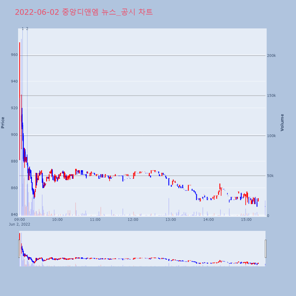 | 2 | [특징주] 중앙디앤엠, 최대주주 에이치에프네트웍스 대상 40억 유증에 오름중앙디앤엠(051980)이 운영자금 확보를 위해 40억 | 조선경제 | 중앙디앤엠 | 2022-06-02 09:12:19 |