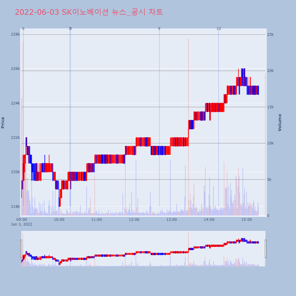 | 9 | [강세 토픽] 전기차 - 배터리 생산 테마, SK이노베이션 +2.78%, LG화학 +2.[전기차 - 배터리 생산] 테마가 강세다. 전일 대비 | 조선경제 | SK이노베이션 | 2022-06-03 12:40:29 |