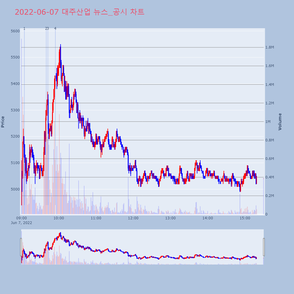| 4 | 대주산업, +16.15% VI 발동대주산업(003310)이 VI가 발동했다. 전일 대비 | 조선경제 | 대주산업 | 2022-06-07 09:54:37 |