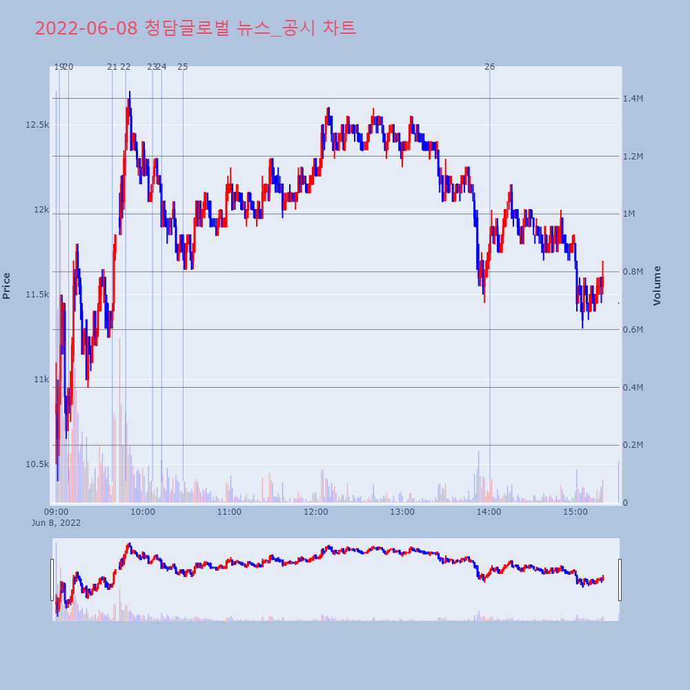 | 12 | [특징주] 청담글로벌, 상장 2거래일 연속 '급등'… '上' 직행 제목 : [특징주] 청담글로벌, 상장 2거래일 연속 ' | 인포스탁 | 청담글로벌 | 2022-06-07 09:40:36 |
