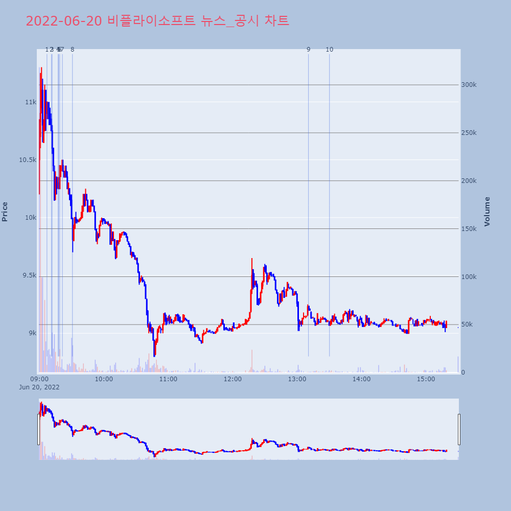 | 8 | [특징주] 비플라이소프트, 상장 첫날 공모가 소폭 상회 제목 : [특징주] 비플라이소프트, 상장 첫날 공모가 | 인포스탁 | 비플라이소프트 | 2022-06-20 09:30:49 |