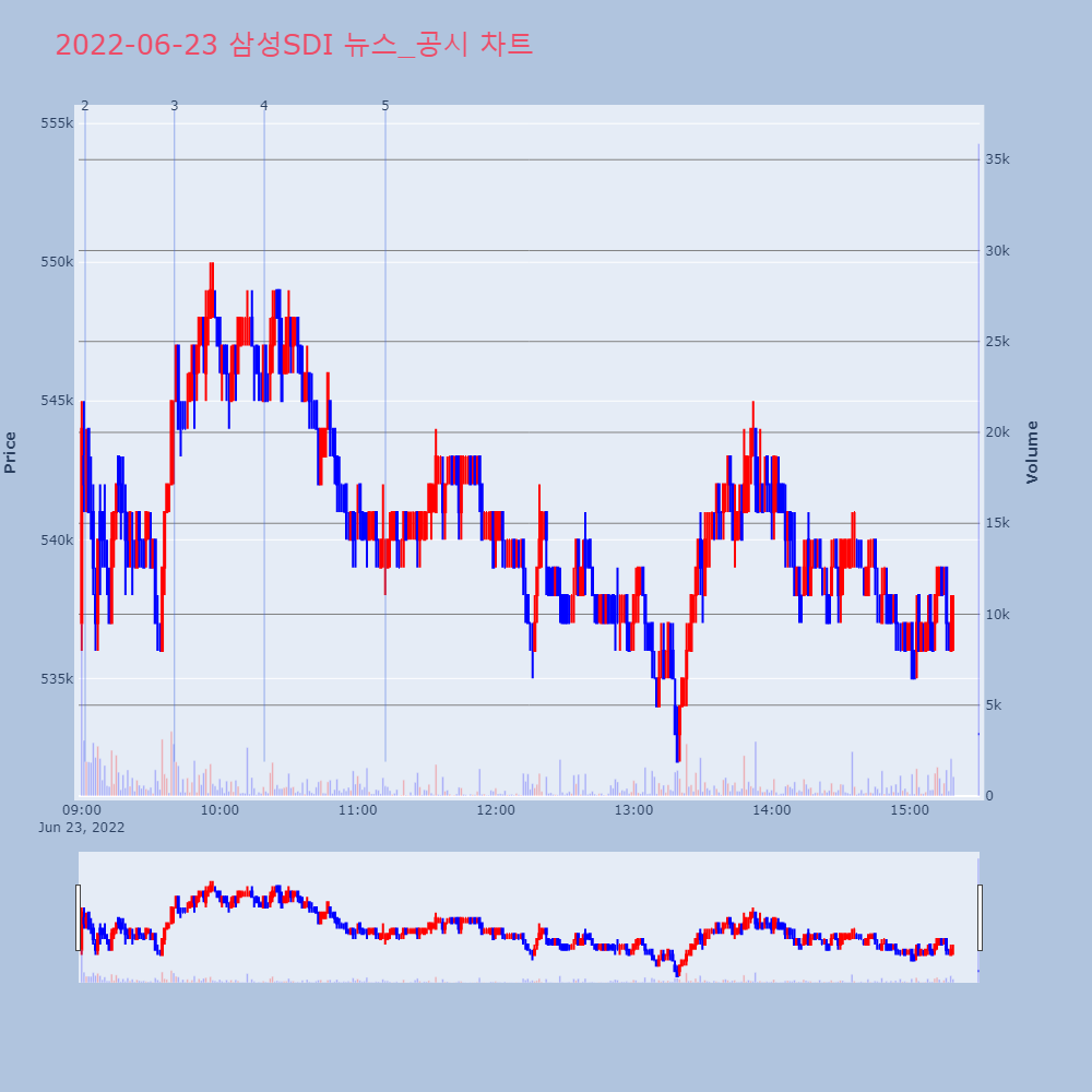 4 | [장중수급포착] 삼성SDI, 기관 9일 연속 순매수행진... 주가 +1.86% [서울=뉴스핌] 로보뉴스 = 23일 10시 15분 현재 | 뉴스핌 | 삼성SDI | 2022-06-23 10:19:24 |