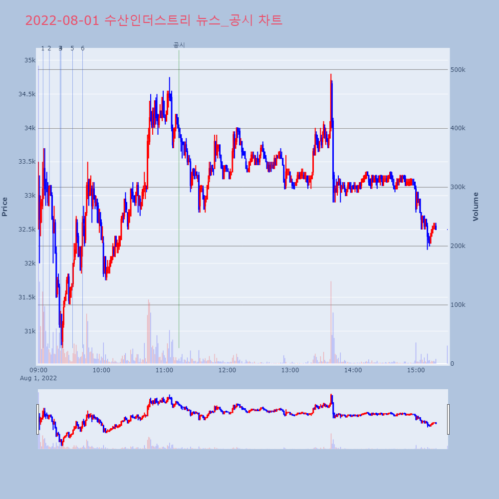 | 7 | [특징주] 수산인더스트리, 코스피 상장 첫날 공모가 하회 마감(종합)[특징주] 수산인더스트리, 코스피 상장 첫날 공모가 하 | 연합뉴스 | 수산인더스트리 | 2022-08-01 15:38:22 |