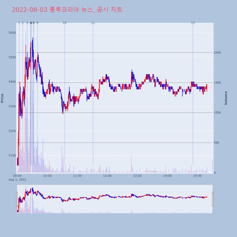 | 6 | 룽투코리아, +10.32% VI 발동룽투코리아(060240)가 VI가 발동했다. 전일 대비 | 조선경제 | 룽투코리아 | 2022-08-03 09:27:52 |