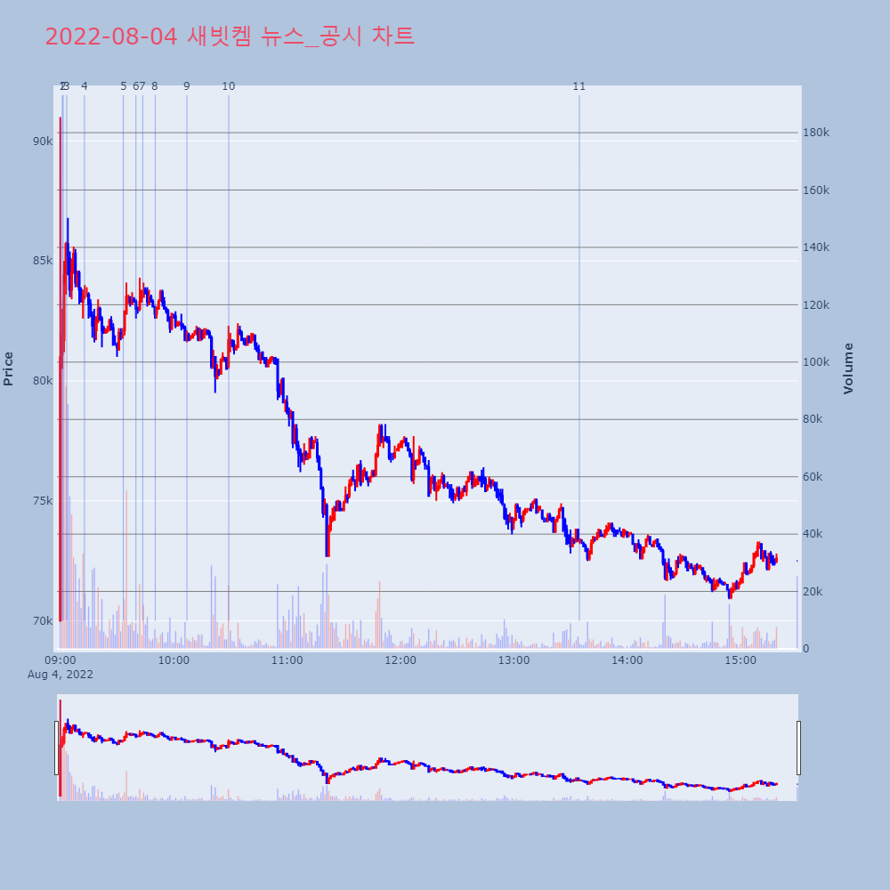 | 8 | [장초반 인기 검색 종목 PICK5] - 새빗켐, 영우디에스피, 한일시멘트... 최적의 매매타이밍을 실시간으로 전송하여 투자자들에게 도 | 파이낸셜 | 새빗켐 | 2022-08-04 09:50:14 |