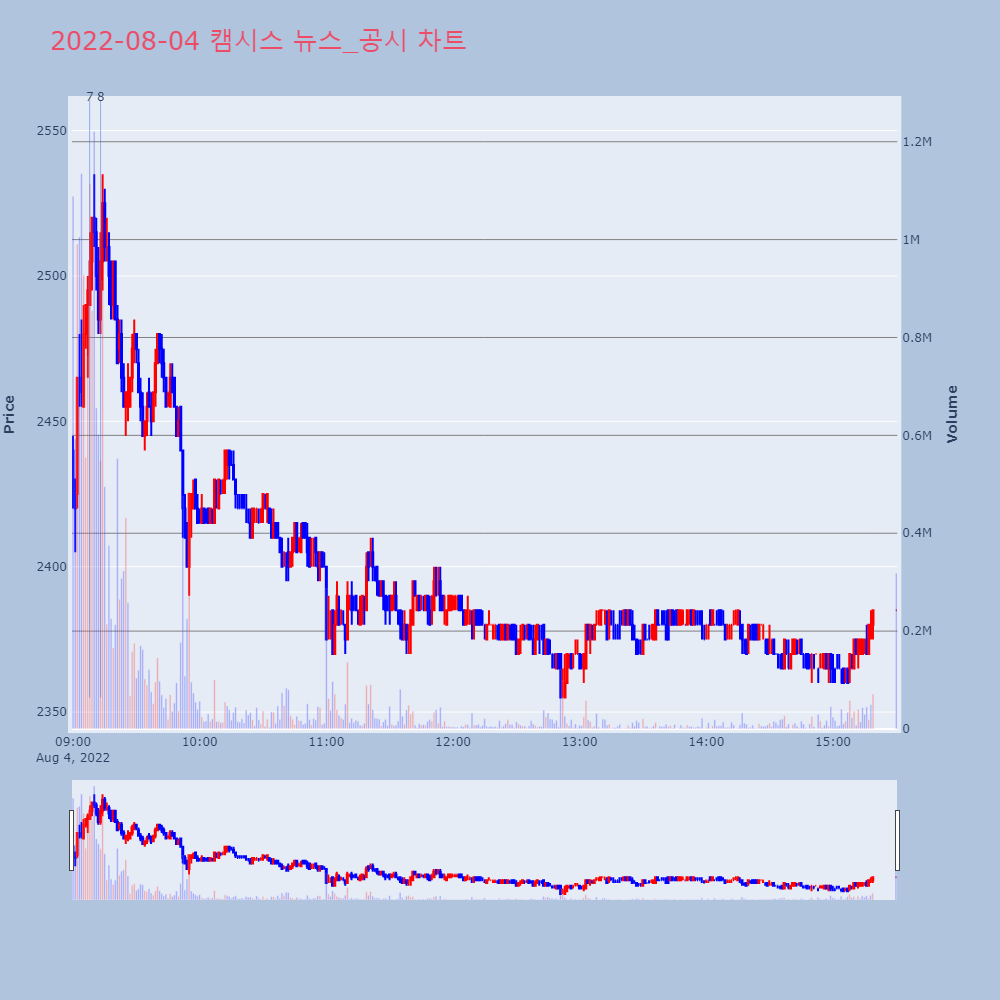 | 2 | 캠시스, 0.00% VI 발동캠시스(050110)가 VI가 발동했다. 현재 2,18 | 조선경제 | 캠시스 | 2022-08-03 09:00:20 |