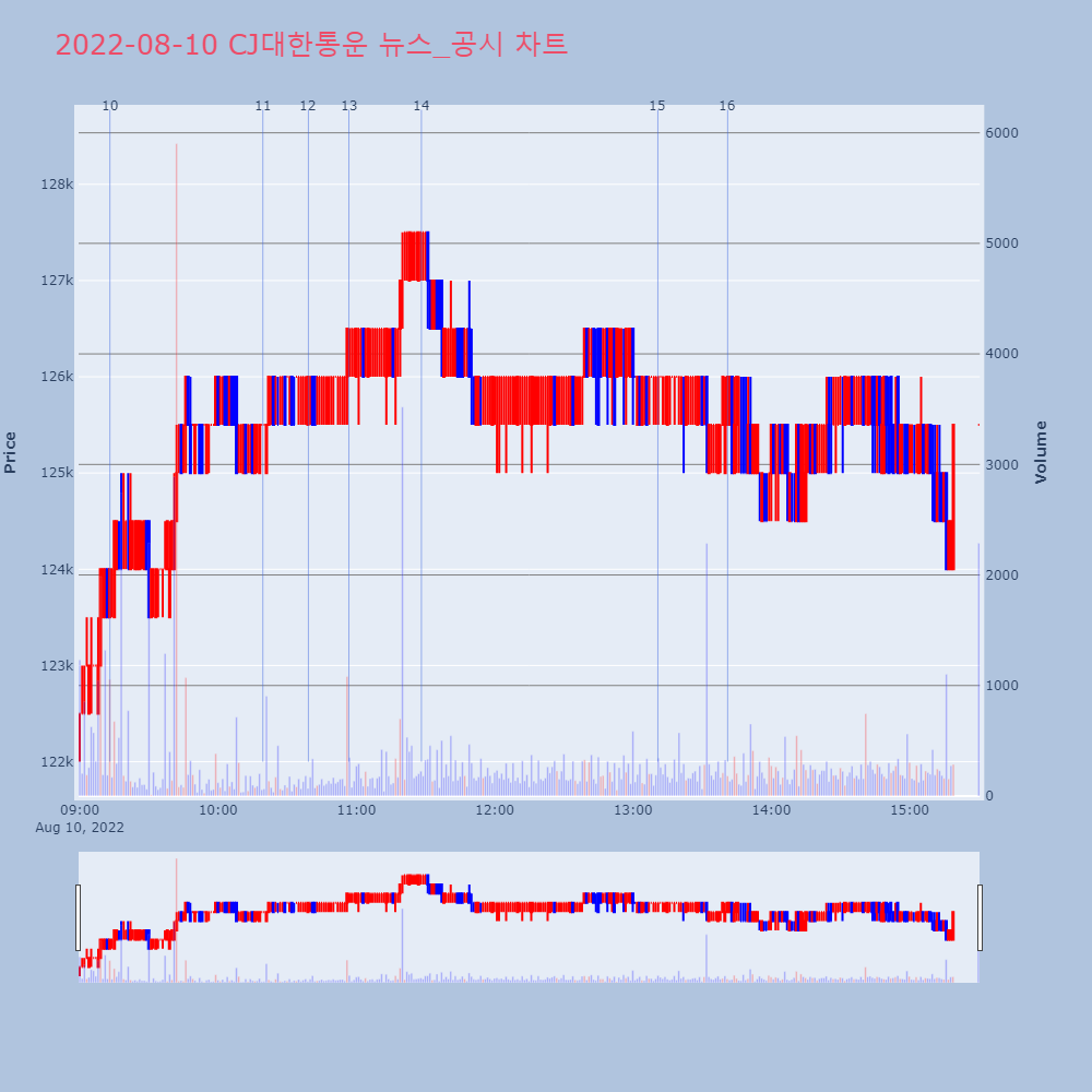 | 2 | [장중수급포착] CJ대한통운, 외국인 18,321주 대량 순매수... 주가 +4.35% [서울=뉴스핌] 로보뉴스 = 09일 10시 15분 현재 | 뉴스핌 | CJ대한통운 | 2022-08-09 10:15:43 |