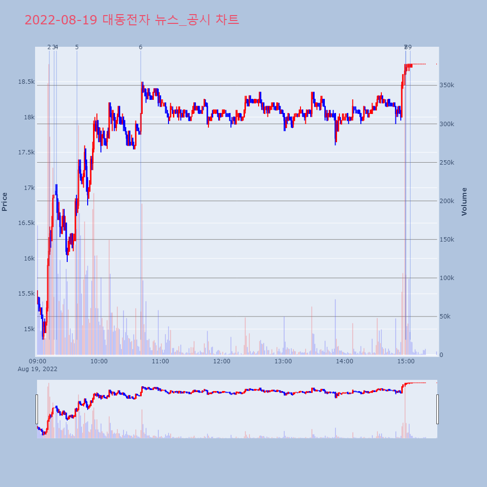 | 3 | 대동전자, +16.96% VI 발동대동전자가 VI가 발동했다. 전일 대비 16.96% 상 | 조선경제 | 대동전자 | 2022-08-19 09:16:12 |