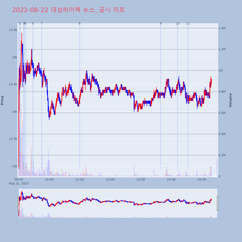 | 6 | [특징주] 대성하이텍, 코스닥 상장 첫 날 강세 제목 : [특징주] 대성하이텍, 코스닥 상장 첫 날 강 | 인포스탁 | 대성하이텍 | 2022-08-22 09:28:00 |