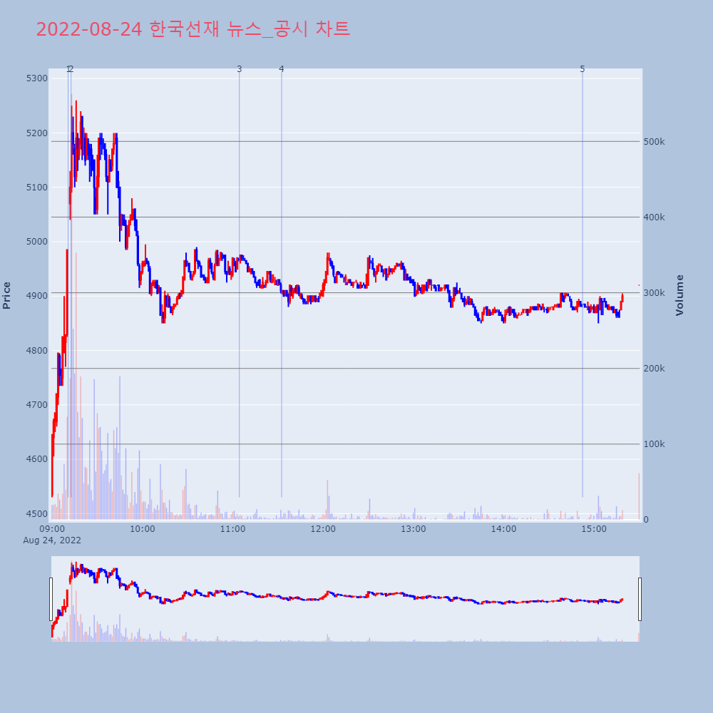 | 4 | [장중수급포착] 한국선재, 외국인/기관 동시 순매수… 주가 +9.44% [서울=뉴스핌] 로보뉴스 = 24일 11시 30분 현재 | 뉴스핌 | 한국선재 | 2022-08-24 11:32:31 |