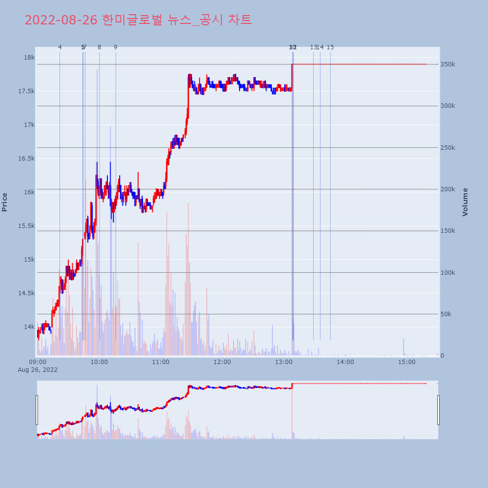| 13 | [특징주] 한미글로벌, 네옴시티 회동 기대감에 '상한가' 제목 : [특징주] 한미글로벌, 네옴시티 회동 기대감에 | 인포스탁 | 한미글로벌 | 2022-08-26 13:29:01 |