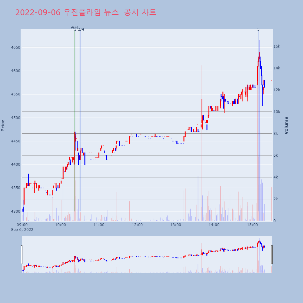 | 4 | [특징주] 우진플라임, 177억 규모 신규시설 투자 결정 소식에 강세 제목 : [특징주] 우진플라임, 177억 규모 신규시설 | 인포스탁 | 우진플라임 | 2022-09-06 10:35:02 |