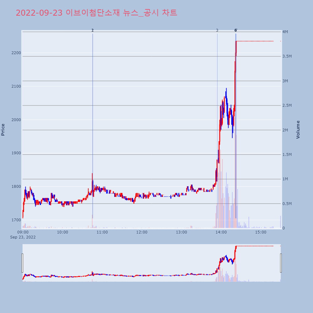 3 | 이브이첨단소재, +8.72% VI 발동이브이첨단소재가 VI가 발동했다. 전일 대비 8.72% | 조선경제 | 이브이첨단소재 | 2022-09-23 13:54:22 |