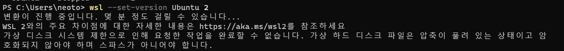 우분투(ubuntu) 설치 후 wsl 2 로 변경중 오류 해결