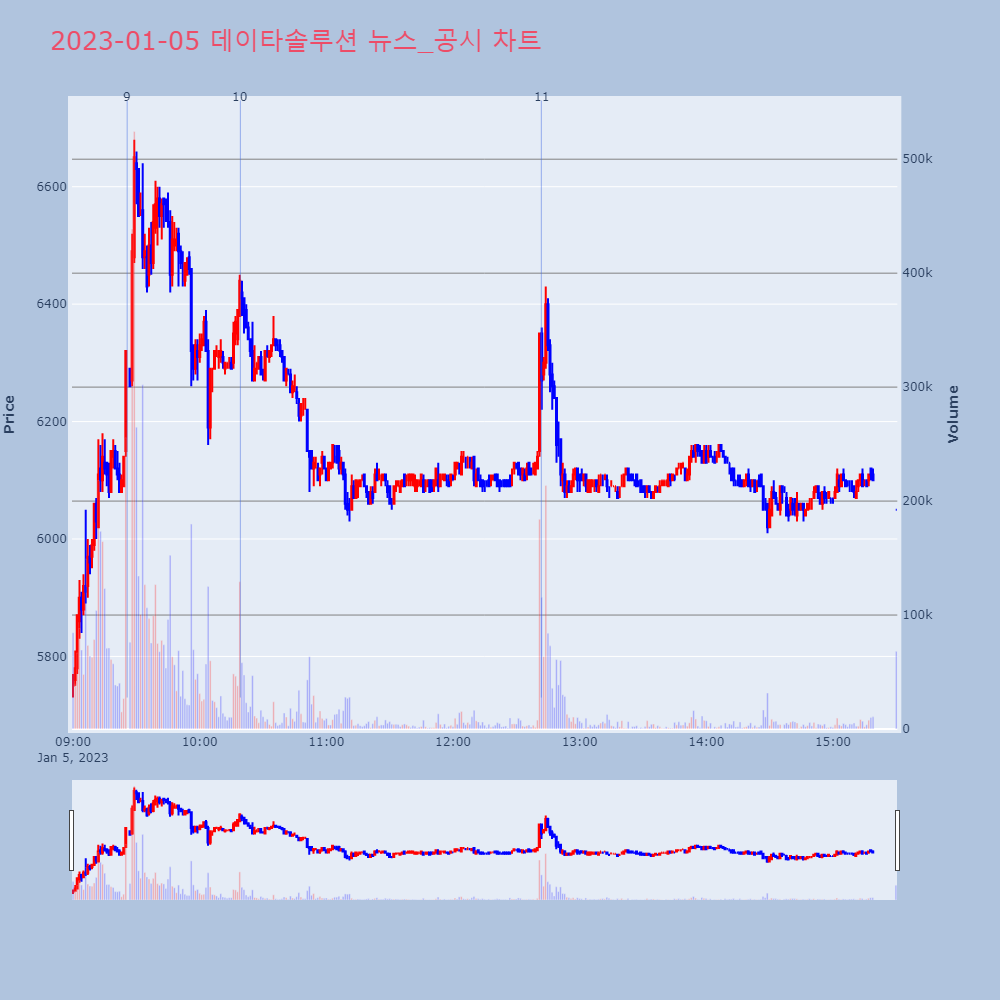9 | 데이타솔루션, +10.88% VI 발동데이타솔루션이 VI가 발동했다. 전일 대비 10.88% | 조선경제 | 데이타솔루션 | 2023-01-05 09:25:38 |