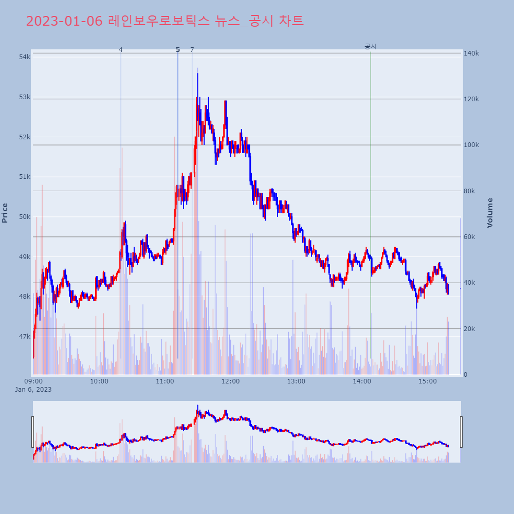 7 | 레인보우로보틱스, +8.84% VI 발동레인보우로보틱스가 VI가 발동했다. 전일 대비 8.84 | 조선경제 | 레인보우로보틱스 | 2023-01-06 11:24:55 |