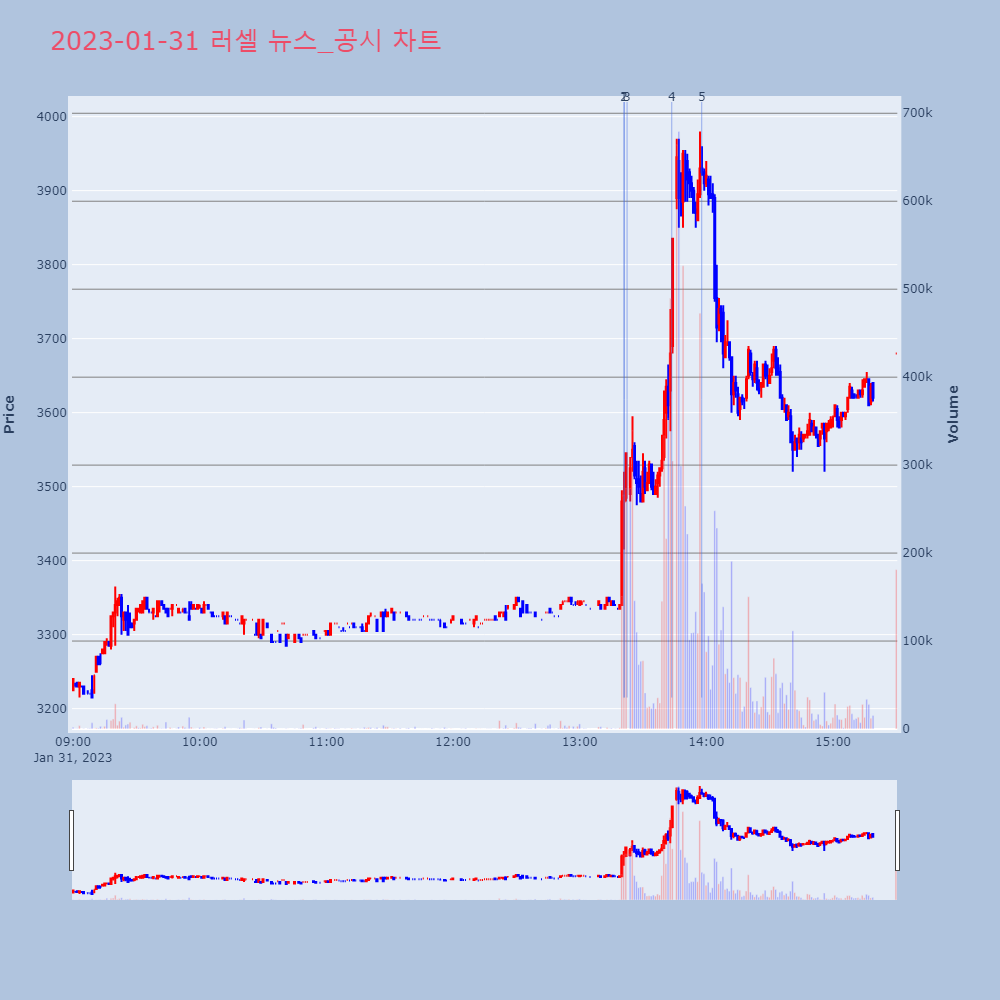 3 | 러셀, +9.92% VI 발동러셀이 VI가 발동했다. 전일 대비 9.92% 상승한 | 조선경제 | 러셀 | 2023-01-31 13:22:28 |