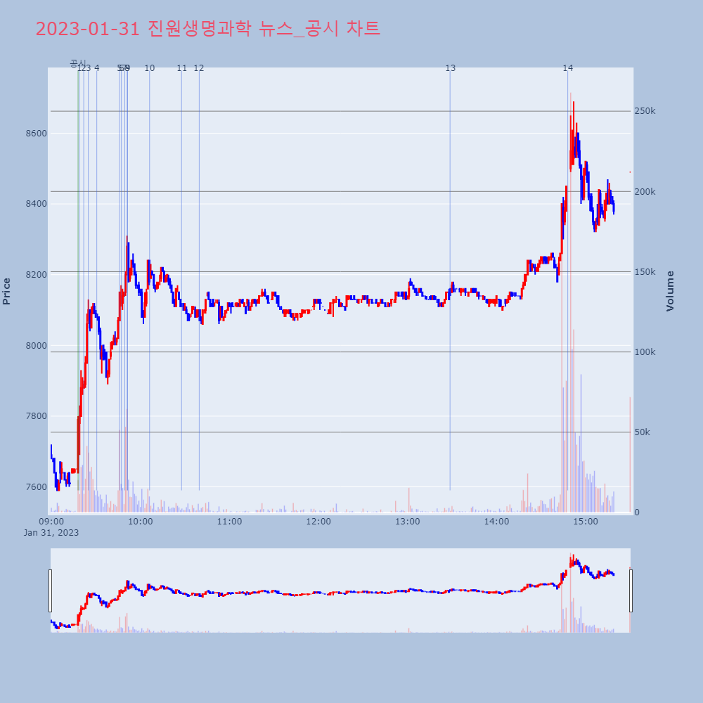 14 | 진원생명과학, +9.88% VI 발동진원생명과학이 VI가 발동했다. 전일 대비 9.88% | 조선경제 | 진원생명과학 | 2023-01-31 14:48:01 |
