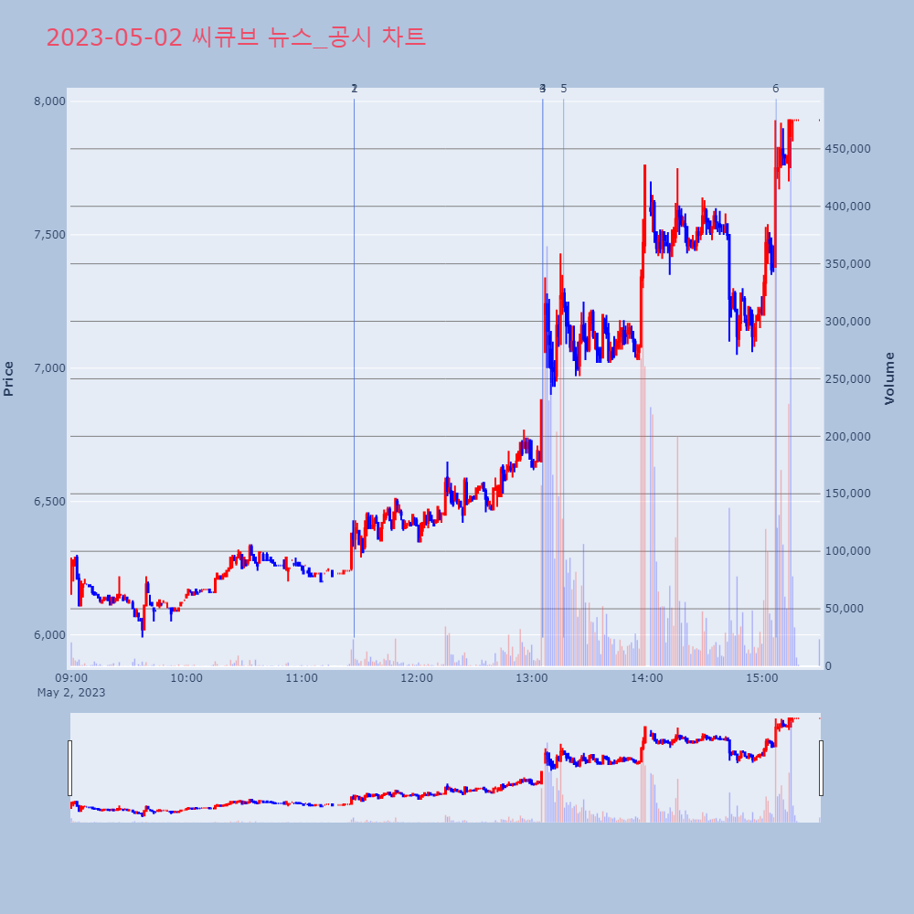 | 6 | 씨큐브, +30.00% 상한가씨큐브가 상한가를 기록했다. 전일 대비 30.00% 상 | 조선경제 | 씨큐브 | 2023-05-02 15:07:25 |